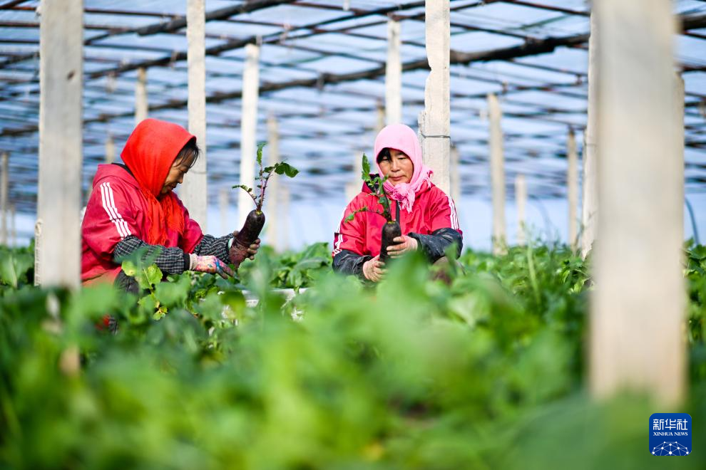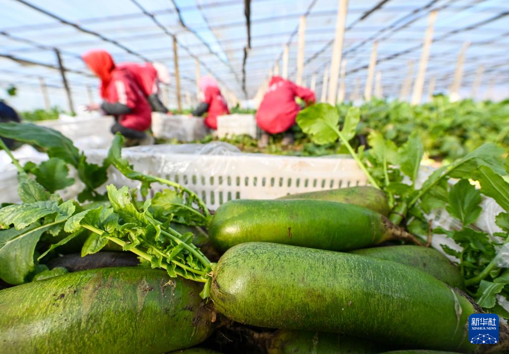 11月20日,在天津市西青區辛口鎮種植沙窩蘿卜的大棚內,農民在采摘蘿卜。