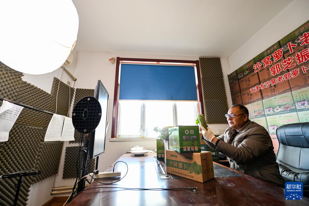 11月20日,在天津市西青區辛口鎮一家蘿卜專業合作社,農戶在直播推廣沙窩蘿卜。