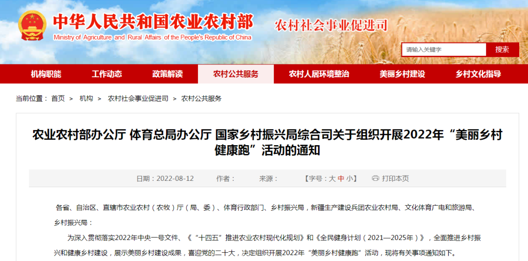 為深入貫徹落實2022年中央一號文件、《“十四五”推進農業農村現代化規劃》和《全民健身計劃(2021—2025年)》,全面推進鄉村振興和健康鄉村建設,展示美麗鄉村建設成果,喜迎黨的二十大,決定組織開展2022年“美麗鄉村健康跑”活動,現將有關事項通知如下。