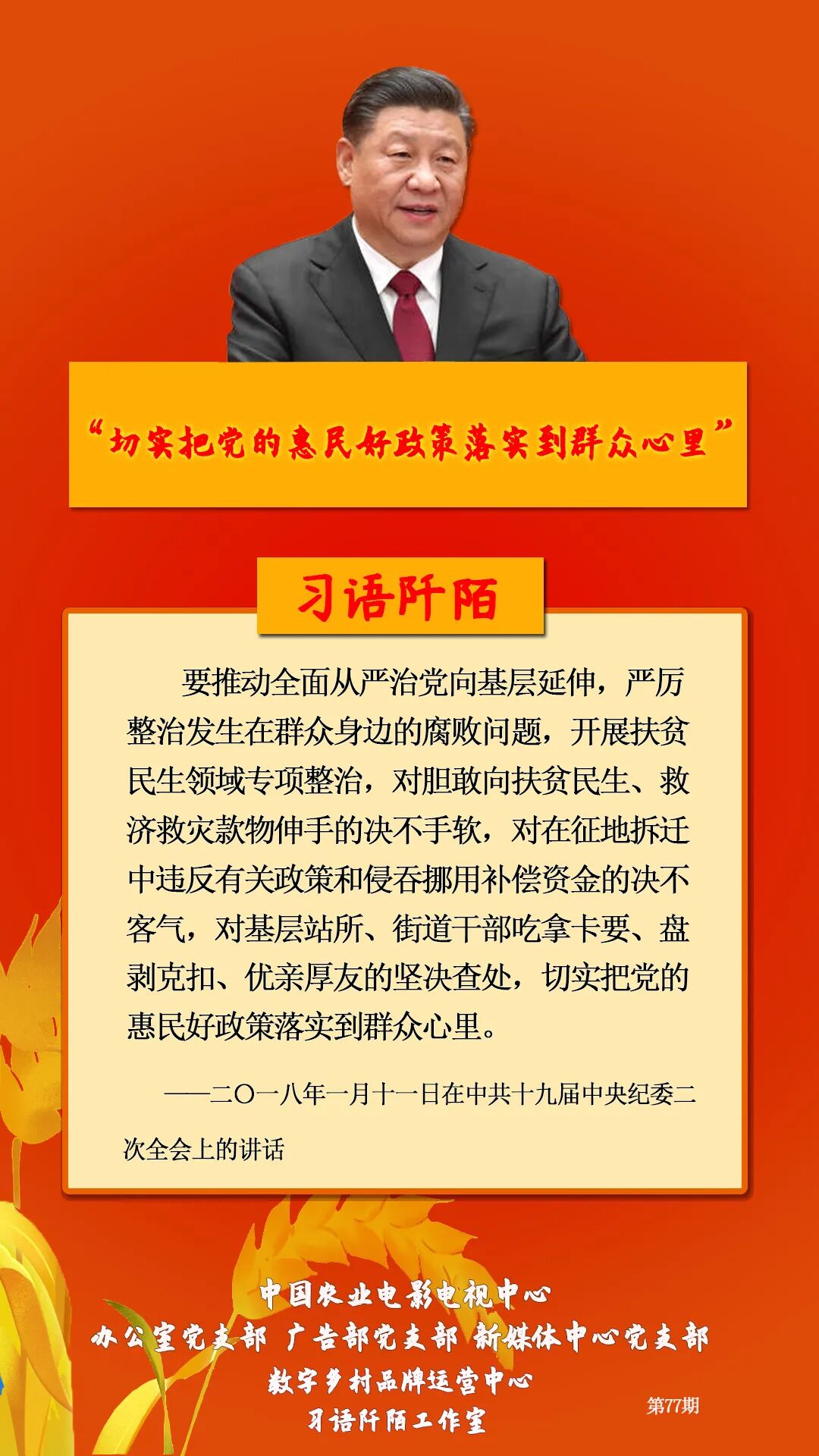 《習語阡陌》欄目由中國農業電影電視中心辦公室黨支部、廣告部黨支部、新媒體中心黨支部、數字鄉村品牌運營中心聯合策劃,以“喜迎二十大 禮贊振興路”為主題,系列宣傳共5季。內容上以習近平總書記關于“三農”工作的重要論述經典語錄開題,并附出處;形式上以圖文為主,短視頻為輔。希望廣大用戶能在原著、原文、原話中感悟習近平總書記的三農思想和為民情懷,以實際行動推動鄉村振興取得新進展,以優異成績迎接黨的二十大勝利召開。