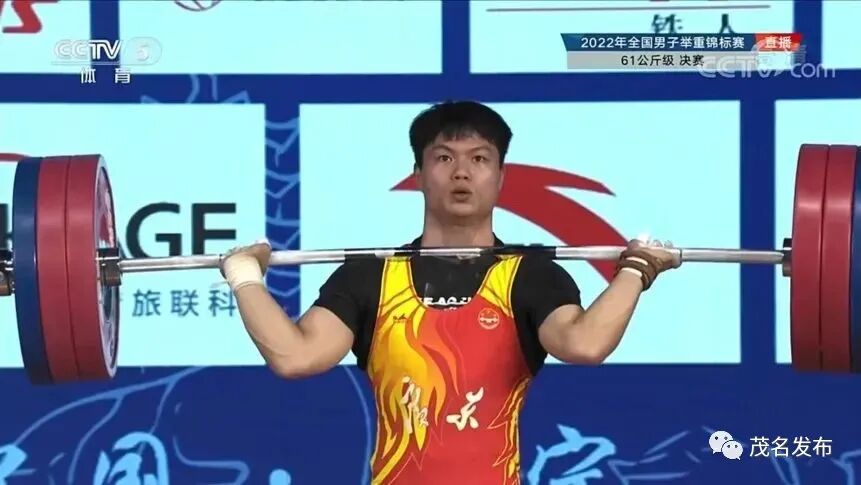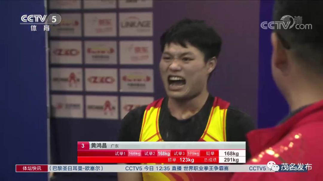 黃鴻昌第一次試舉雖然舉起了杠鈴,但因為手肘屈伸被判試舉失敗。緊接的第二次試舉中,黃鴻昌及時調整狀態,穩穩舉起168公斤的杠鈴,試舉成功后的黃鴻昌興奮地揮拳慶祝。
